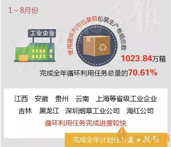 工業(yè)企業(yè)累計使用循環(huán)利用包裝箱包裝生產(chǎn)卷煙1023.84萬箱,完成全年循環(huán)利用任務總量的70.61%。其中,浙江、重慶、安徽、江蘇、福建、云南、北京等省級商業(yè)企業(yè)總體返還比例較高,返還率均超過100%;江西、安徽、貴州、云南、上海等省級工業(yè)企業(yè)及中國煙草實業(yè)發(fā)展中心所屬吉林、黑龍江、深圳煙草工業(yè)有限責任公司和海南紅塔卷煙有限責任公司循環(huán)利用任務完成進度較快,已累計完成全年計劃任務量的80%以上。