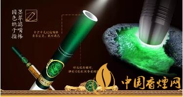 取出煙支,碧玉通透,上有祥云狀龍騰圖標(biāo)和金色翡翠字樣,近煙端為金色“EMERALD”字母和回形紋環(huán)繞,輔之于中空中支過(guò)濾嘴棒及獨(dú)創(chuàng)功能性載香卷煙紙,集外觀與功能于一身。