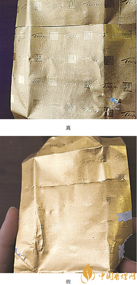 5、錫箔紙。在一定側(cè)光角度下,真煙錫箔紙印刷清晰,有光澤,凹凸感強(qiáng);假煙則字跡不清,色澤暗淡,沒有立體感。