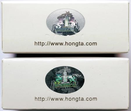 背面商標(biāo)紙印刷工藝差異對(duì)比:真品商標(biāo)紙采用白卡紙,凹印印刷,“Hongtashan”字體用手摸沒有凹凸感,“紅塔”左邊上下兩朵云距離塔身較遠(yuǎn);假煙采用高清掃描仿制印刷,“Hongtashan”字體用手摸有凹凸感,“紅塔”左邊上下兩朵云離塔較近,與真品特征存在明顯差異。