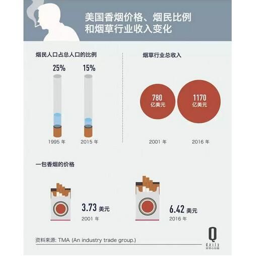 根據(jù)市場調(diào)研公司的報(bào)告,2001 年至 2016 年期間,美國香煙的銷售數(shù)量減少了 37%,與此同時,美國吸煙人口的比例也下降了,但煙草公司的利潤卻上升了。在2016 年,美國煙草行業(yè)的利潤達(dá)到了 184 億美元。(跟我國一比這好像都不算什么了)
