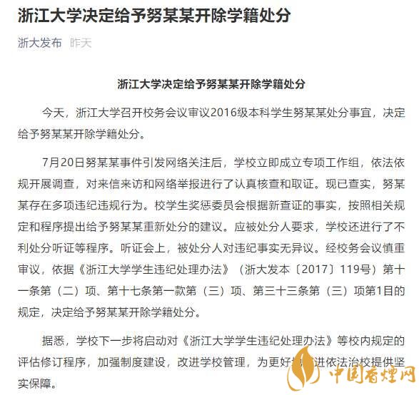 浙大表示,現(xiàn)已查實,努某某存在多項違紀(jì)違規(guī)行為。浙大學(xué)生獎懲委員會根據(jù)新查證的事實,按照相關(guān)規(guī)定和程序提出給予努某某重新處分的建議。應(yīng)被處分人要求,學(xué)校還進行了不利處分聽證等程序。聽證會上,被處分人對違紀(jì)事實無異議。經(jīng)浙江大學(xué)校務(wù)會議慎重審議,依據(jù)《浙江大學(xué)學(xué)生違紀(jì)處理辦法》(浙大發(fā)本〔2017〕119號)相關(guān)規(guī)定,決定給予努某某開除學(xué)籍處分。