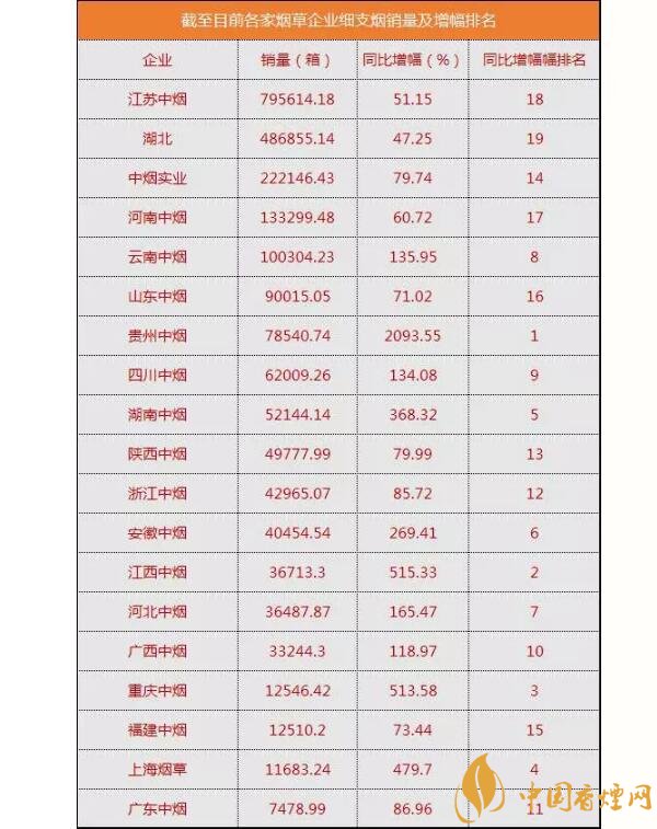 表格中,細支煙銷售量排名銷量總量位居首位的依然是江蘇中煙。雖然,今年各地反映炫赫門限量供應(yīng),但依然沒有撼動蘇產(chǎn)細支第一的地位。最新統(tǒng)計消息稱,南京(炫赫門)截至11月底的銷量早已突破了55萬箱,這樣的炫赫門真的很贊!增幅最為明顯是貴州中煙,78540.74箱銷量。其中功不可沒的當初貴煙(跨越)。這款去年上市的新品,今年1—11月份的銷量統(tǒng)計,已經(jīng)超過了5.8萬箱,成為了國內(nèi)細支爆珠的第一大規(guī)格。#p#副標題#e#