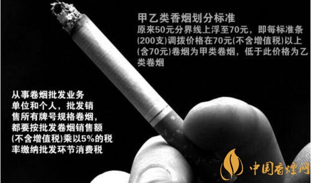 甲類卷煙(調(diào)撥價(jià)70元或以上/條):稅率56%,另收0.003元/支,于生產(chǎn)環(huán)節(jié)征收;乙類卷煙(調(diào)撥價(jià)低于70元/條):稅率36%,另收0.003元/支,于生產(chǎn)環(huán)節(jié)征收;