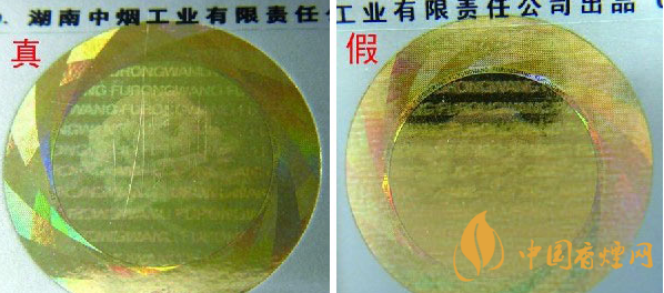 ②迎光觀察激光全息圖案:真品卷煙圖案內拼音字母、芙蓉花及“芙蓉王”轉換不同角度,都會呈現(xiàn)不同圖案的切換,且層次清晰、字體完整;假冒卷煙無論如何轉換角度,都無法達到完美切換,字體模糊,圖案缺失嚴重。