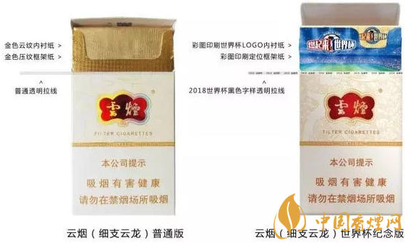 大家可能也了解國產(chǎn)中高檔香煙價格表和圖片,云煙占據(jù)主要市場。本次世界杯版對以下產(chǎn)品的條盒、小盒進行了局部改版調(diào)整,具體調(diào)整:小盒翻蓋內(nèi)定位卡紙印刷世界杯元素、小盒內(nèi)襯紙彩圖印刷世界杯元素、小盒拉線增加“2018世界杯”金色字樣、條盒拉線增加“2018世界杯”金色字樣。下面一起來看看細節(jié)對比圖吧。
