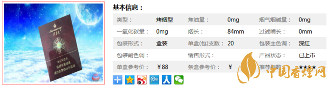 類(lèi)型 :烤煙型 焦油量 :9mg 煙氣煙堿量 :0.9mg 一氧化碳量 :9mg