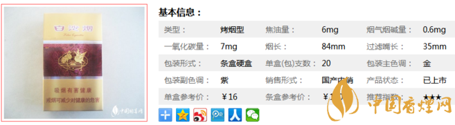 | 類(lèi)型 :烤煙型 | 焦油量 :6mg | 煙氣煙堿量 :0.6mg | 一氧化碳量 :7mg |