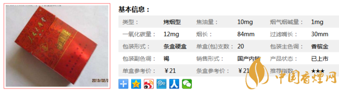| 類型 :烤煙型 | 焦油量 :10mg | 煙氣煙堿量 :1mg | 一氧化碳量 :12mg |
