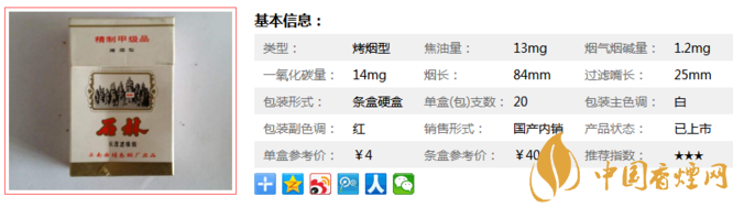 石林硬香煙,煙支長(zhǎng)84mm,在開(kāi)發(fā)過(guò)程中,經(jīng)與國(guó)外有實(shí)力的知名香料公司多次進(jìn)行合作研究,研發(fā)試驗(yàn)200多次,最賦予該產(chǎn)品獨(dú)特的加香加料風(fēng)格。下面我們一起來(lái)看石林硬的參數(shù)信息:焦油量:13mg 煙堿量:1.2mg 一氧化碳量:14mg.