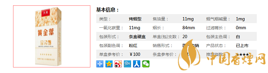 | 類(lèi)型 :烤煙型 | 焦油量 :11mg | 煙氣煙堿量 :1mg | 一氧化碳量 :11mg |