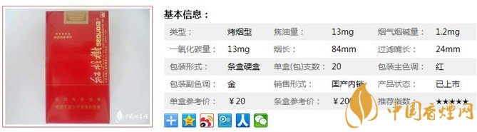 | 類型 :烤煙型 | 焦油量 :13mg | 煙氣煙堿量 :1.2mg | 一氧化碳量 :13mg |