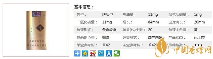 | 類(lèi)型 :烤煙型 | 焦油量 :11mg | 煙氣煙堿量 :1mg | 一氧化碳量 :11mg |