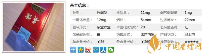 | 類型 :烤煙型 | 焦油量 :11mg | 煙氣煙堿量 :1mg | 一氧化碳量 :12mg |
