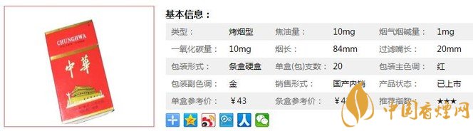 中華硬10mg話梅香味濃郁可口,聞味就好像蜜制的話梅,香氣雖然濃郁但要比硬中稍微清淡一些。此煙味道淳柔,柔中帶剛,不管你是老煙槍還是喜歡味淡的煙民,此煙都適合。入口后,沒有異味,這點十分難得。經香煙網小編市場調查中華硬10mg售價為43元/包。