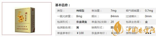 類型 :烤煙型 焦油量 :7mg 煙氣煙堿量 :0.7mg 一氧化碳量 :8mg