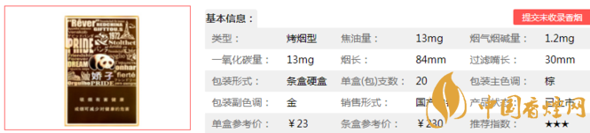 | 類型 :烤煙型 | 焦油量 :13mg | 煙氣煙堿量 :1.2mg | 一氧化碳量 :13mg |