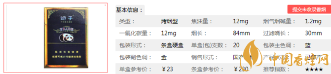 嬌子國(guó)寶藍(lán)天嬌煙支長(zhǎng)84mm,過(guò)濾嘴30mm,全面應(yīng)用具有自主知識(shí)產(chǎn)權(quán)、獲五項(xiàng)國(guó)家發(fā)明專利的復(fù)合生物制劑,以卟啉融合多種天然植物提取活性成分,可有效降低卷煙煙氣中四類十余種有害成分,是嬌子專利減害與配方技術(shù)完美結(jié)合的體現(xiàn)。下面我們一起來(lái)看嬌子國(guó)寶藍(lán)天嬌的參數(shù)信息:焦油量:12mg 煙堿量:1.2mg 一氧化碳量:12mg