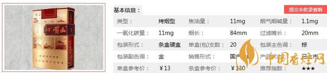 | 類(lèi)型 :烤煙型 | 焦油量 :10mg | 煙氣煙堿量 :1.1mg | 一氧化碳量 :12mg |