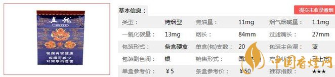類(lèi)型 :烤煙型 焦油量 :11mg 煙氣煙堿量 :1.1mg 一氧化碳量 :13mg