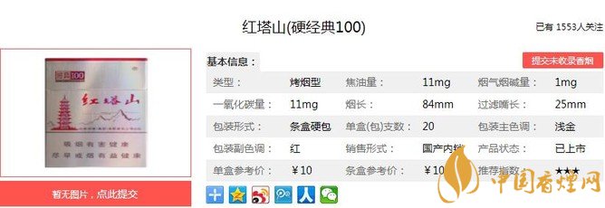 紅塔山硬經(jīng)典100煙支長84mm,過濾嘴長:25mm,通過采用“四多一小”的配方技術(shù)、功能性加香加料技術(shù)、生物技術(shù)、“三紙一棒”配伍性技術(shù)等多項研究技術(shù)綜合集成,下面我們一起來看紅塔山硬經(jīng)典100的參數(shù)信息:焦油量:11mg 煙堿量:1.0mg 一氧化碳量:11mg