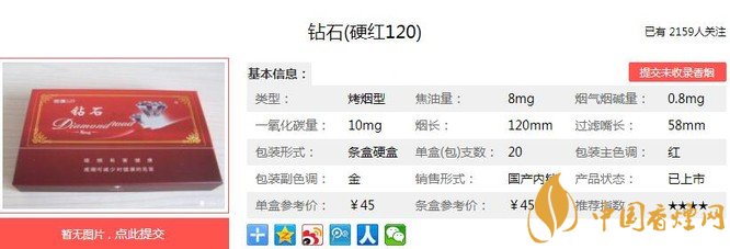 對所有原料進行科學(xué)的理化分析,選用了香氣足、煙堿高、焦油低的巴西、津巴布韋及國內(nèi)優(yōu)質(zhì)且自然醇化的煙葉。香煙價位中等,質(zhì)量比較不錯,在市場上獲得高端消費者的認同和追捧。經(jīng)香煙網(wǎng)小編市場調(diào)查鉆石硬紅120售價為45元/包。
