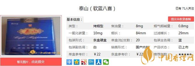 泰山八喜軟藍整合前為八喜精品,是“八喜”系列中評價最好、性價比最高的一款香煙。衣著靚麗藍冠身,背靠泰山喜進門,馥郁香甜祥瑞現(xiàn),優(yōu)容雅貴復(fù)清醇。經(jīng)香煙網(wǎng)小編市場調(diào)查泰山軟藍八喜售價為22元/包。