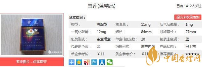 雪蓮藍精品煙支長84mm,過濾嘴長27mm,優(yōu)選國內(nèi)優(yōu)質(zhì)煙葉,應(yīng)用高分子合成技術(shù)等多項現(xiàn)代工藝技術(shù)精制而成;香氣自然、高雅,余味醇厚、干凈舒適。下面我們一起來看雪蓮藍精品的參數(shù)信息:焦油量:11mg 煙堿量:1.0mg 一氧化碳量:12mg
