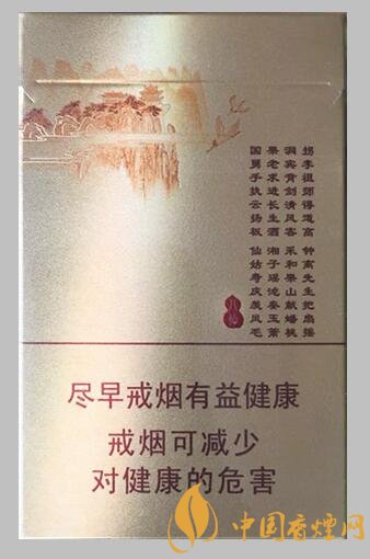煙盒正面翻蓋處的八仙過海四字的設計,有些與金圣的滕王閣相似。主圖為騰云駕霧的老哥八個,應該屬于線條畫的類型。警示語句為最新版本。整體為三段,最上段為燙金畫面,顏色與最下面部位相同。煙盒背面采用七言律詩的格式,簡介了八仙各自的特點。整體包裝十分有神韻。