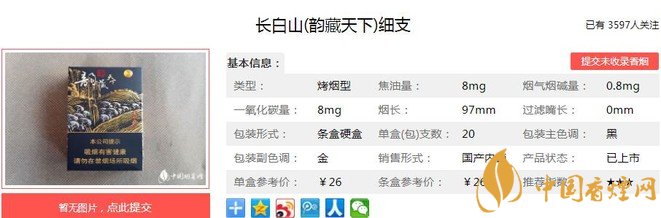 長(zhǎng)白山韻藏天下細(xì)支煙支長(zhǎng)97mm,專有的沉香活性成分制備技術(shù)及沉香載體柔性加工技術(shù),保障了香氣釋放量的均勻一致,吸煙過程更輕松。下面我們一起來看長(zhǎng)白山韻藏天下細(xì)支的參數(shù)信息:焦油量:8mg 煙堿量:0.8mg 一氧化碳量:8mg