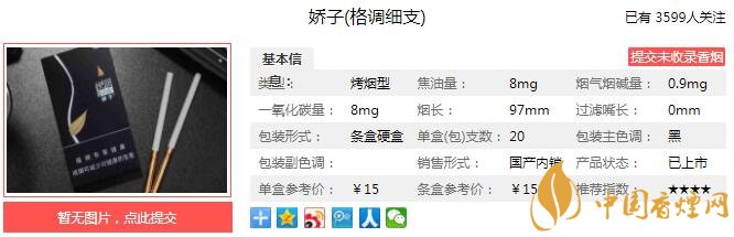 嬌子格調(diào)細(xì)支煙支長(zhǎng)97mm,過濾嘴長(zhǎng)32mm,通過遴選涼山煙葉配以其他優(yōu)質(zhì)煙區(qū)煙葉,結(jié)合多項(xiàng)增香保潤(rùn)自主專利技術(shù),在清潤(rùn)厚甜的煙香中凸顯了返璞歸真的原煙本香,賦予了其與眾不同的“清甜香格調(diào)”。下面我們一起來看嬌子格調(diào)細(xì)支的參數(shù)信息:焦油量:8mg 煙堿量:0.9mg 一氧化碳量:8mg