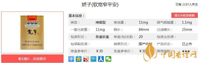 以上便是香煙網(wǎng)小編為大家介紹的關(guān)于嬌子寬窄平安價(jià)格30元一包,傳承寬窄系列的口感!的相關(guān)信息,看完之后大家是不是對(duì)于嬌子(寬窄平安)的相關(guān)信息更加了解呢。大家還想查詢更多的相關(guān)內(nèi)容歡迎點(diǎn)擊:嬌子寬窄好運(yùn)細(xì)支多少錢(qián)一包 寬窄好運(yùn)細(xì)支口感分析