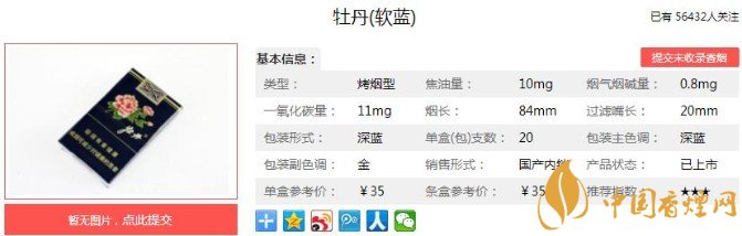 以上便是香煙網(wǎng)小編為大家介紹的關(guān)于清新包裝優(yōu)雅煙香,牡丹軟藍的價格35元一包!的相關(guān)信息,看完之后大家是不是對于牡丹(軟藍)的相關(guān)信息更加了解呢。大家還想查詢更多的相關(guān)內(nèi)容歡迎點擊:牡丹金細支多少錢一包 牡丹金細支口感及參數(shù)介紹