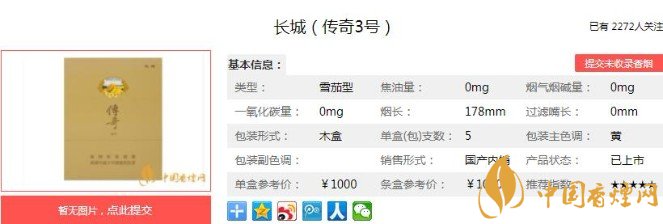 傳奇3號(hào)走的是精品路線,純手工制作,每根都是力求最好,抽起來的煙氣醇和,富有感覺。下面便是長城(傳奇3號(hào))的基本參數(shù):焦油量:中,木盒(每盒5支,每條1盒):長度 178mm,直徑 18.7mm,環(huán)徑 58.7mm.