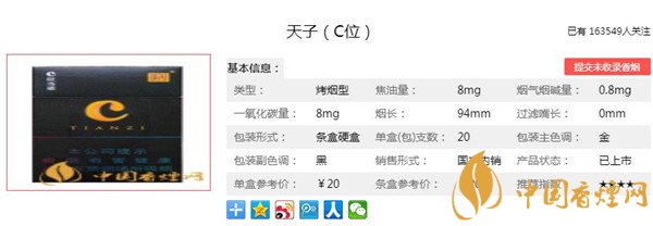 天子(C位)這款香煙,目前的售價(jià)是20元一包。這款香煙從上市以來的感覺,反響并不是非常好,可能是因?yàn)橹貞c中煙宣傳的不要到位吧。口感上面,這款香煙的口感并不是非常的典型,有些人覺得抽的舒服有些人覺得不能接受,具體還是看個(gè)人口味,價(jià)格方面這款香煙的不算貴的。