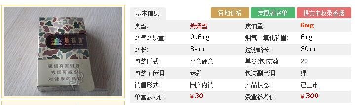 | 煙長(zhǎng):84mm | 過濾嘴長(zhǎng):30mm | 包裝形式:條盒硬盒 | 單盒(包)支數(shù):20 |
