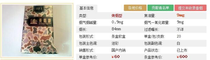 黃鶴樓香煙大彩(硬)綜合應(yīng)用國內(nèi)多產(chǎn)區(qū)煙葉,凸顯立體吸味。在配方技術(shù)上,充分利用增香功能薄片、亮色煙等復(fù)合配方技術(shù),在豐富了產(chǎn)品香韻,降低焦油至6毫克。黃鶴樓大彩的煙支采用了焦油標(biāo)尺刻度,消費(fèi)者可以輕松了解并掌控?cái)z入的焦油含量。采用大漠迷彩紋飾,賦予產(chǎn)品特別的身份象征,與其他產(chǎn)品形成天然的視覺區(qū)隔,帶、一股特別的時(shí)尚硬朗氣息。