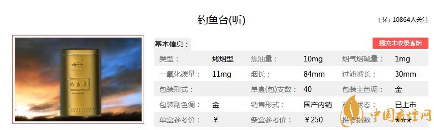 釣魚臺(聽)過濾嘴內(nèi)添加物可阻斷或抑制煙氣中有害物質。煙香醇和舒適,口感津甜圓潤。