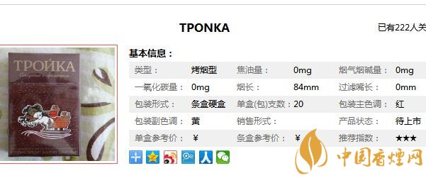TPONKA(三套車)香煙是俄羅斯的香煙品牌,由于俄羅斯香煙都存在一個(gè)特點(diǎn),也許是戰(zhàn)斗名族特有的吧,他們的香煙都是非常的烈的,那么在了解俄羅斯TPONKA香煙價(jià)格表之前,先來(lái)看一看tponka香煙多少錢一包,這款香煙的參考價(jià)為15元/包。