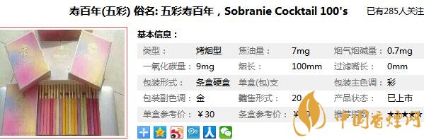 Sobranie譯為壽百年,為日本煙草公司所屬英國加萊赫公司產(chǎn)品,作為一個(gè)主要消費(fèi)對象是女性的香煙品牌,這款壽百年(五彩),也是表現(xiàn)的非常好,那么在對五彩壽百年香煙價(jià)格表進(jìn)行一個(gè)詳細(xì)的分析之前,先來看一看五彩壽百年多少錢一包,它的零售價(jià)為30元/包。