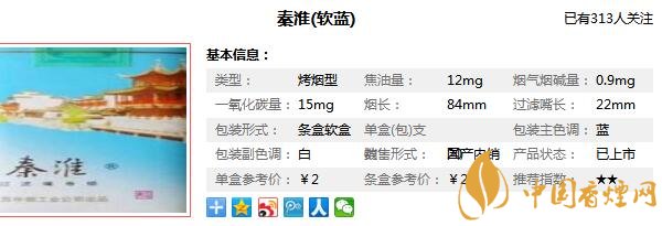 秦淮香煙系江蘇中煙出品,烤煙型香煙,由于種種原因,現(xiàn)如今這個品牌的香煙已經(jīng)退出市場了,先如今留給后人的只有懷念,這也是中國煙草市場不變的定律,那么在對秦淮香煙價格表進(jìn)行介紹之前,先來看一看這款秦淮煙多少錢一包,這款秦淮(軟藍(lán))的售價為2元/包。