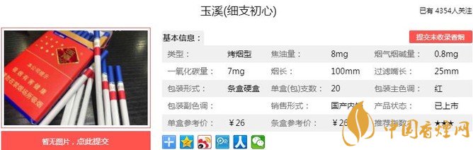 玉溪細(xì)支初心煙支長(zhǎng)100mm,過(guò)濾嘴長(zhǎng):25mm,應(yīng)用自主特色加香技術(shù),彰顯涼茶生津回甜與煙香醇和飽滿的有機(jī)融合,強(qiáng)化清新、自然、優(yōu)雅的復(fù)合清香型風(fēng)格。下面我們一起來(lái)看玉溪細(xì)支初心的參數(shù)信息:焦油量:8mg 煙堿量:0.8mg 一氧化碳量:7mg
