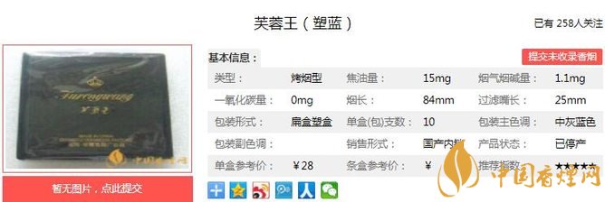 芙蓉王塑藍(lán)煙支長84mm,過濾嘴長:25mm,包裝設(shè)計大氣精致,十支包裝突顯此煙的與眾不同,可謂支支珍貴。下面我們一起來看芙蓉王塑藍(lán)的參數(shù)信息:焦油量:15mg 煙堿量:1.1mg