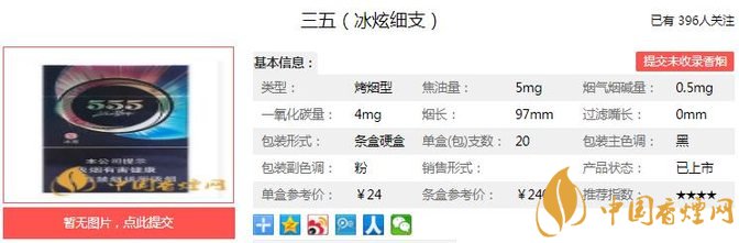 三五冰炫細支煙支長97mm,過濾嘴長不詳,定位在細支煙品類。煙支很飽和,煙嘴也是網(wǎng)狀圖案,在上方有個和外盒爆珠圖案一樣的,標注的是爆珠位置,煙嘴與煙支分隔處是一條細紫色和一條寬銀色圍繞起來,在銀圈上有555字標。下面我們一起來看三五冰炫細支的參數(shù)信息:焦油量:5mg 煙堿量:0.5mg 一氧化碳量:4mg