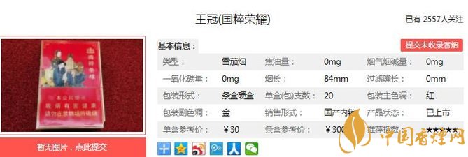 王冠雪茄享譽國內(nèi),旗下的雪茄型香煙多以弘揚中華文化為主題,包裝風格新穎時尚,文化底蘊豐富??诟写枷慵毮?,煙香持久,回味悠長,令國內(nèi)消費者倍為推崇。注重生活品味的煙客對它旗下的香煙都格外的青睞。下面就由香煙網(wǎng)小編帶大家一起來了解王冠國粹榮耀的相關(guān)信息。