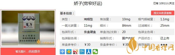 類型 :烤煙型 焦油量 :10mg 煙氣煙堿量 :1.1mg 一氧化碳量 :11mg