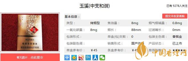 玉溪中支和諧煙支長88mm,煙支是10-10排列的,濾嘴是深棕色,上面印有排列整齊的淡金色小方塊點,爆珠標記是一個小圓點在爆珠一側(cè)是貝字,一側(cè)是母字。下面我們一起來看玉溪中支和諧的參數(shù)信息:焦油量:8mg 煙堿量:0.8mg 一氧化碳量:8mg