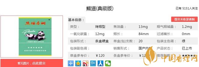 熊貓(典藏版)煙支長84mm,過濾嘴長30mm,金色“熊貓”、藍色“Panda”的字樣印在橫紋卷煙紙上,導致煙條段的視覺效果很短。煙絲為純?nèi)~絲,無填料,金黃油潤,柔軟整齊,品質(zhì)上乘。下面我們一起來看熊貓(典藏版)的參數(shù)信息:焦油量:13mg 煙堿量:1.2mg 一氧化碳量:12mg