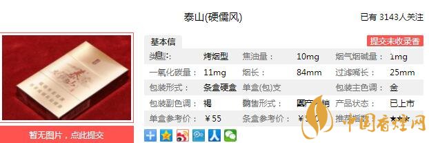 泰山硬儒風煙支長84mm,過濾嘴長25mm,“儒風泰山”的配方和調(diào)香技術(shù)嫁接了緩解精神壓力的“香薰”機理,發(fā)揮SPA功效創(chuàng)造出一種“心悅神定”的氣氛。下面我們一起來看泰山硬儒風的參數(shù)信息:焦油量:10mg 煙堿量:1.0mg 一氧化碳量:11mg