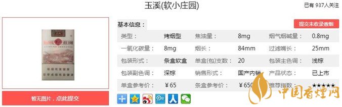 玉溪軟小莊園煙支長(zhǎng)84mm,過(guò)濾嘴長(zhǎng)25mm,專(zhuān)為高端卷煙研發(fā)的功能性卷煙紙,提升煙氣抽吸品質(zhì),并能有效降低煙氣中一氧化碳釋放量。采用煙氣截留效率更高的天然紙質(zhì)濾材,制成獨(dú)特的瓦楞狀濾棒,改變煙氣過(guò)濾機(jī)理,大幅降低煙氣有害成分。下面我們一起來(lái)看玉溪軟小莊園的參數(shù)信息:焦油量:8mg 煙堿量:0.8mg 一氧化碳量:8mg
